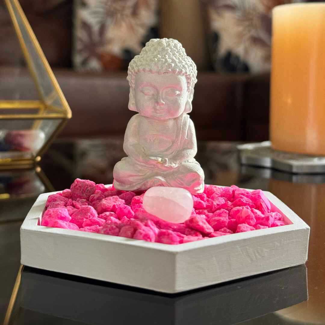 Este Jardín Zen Hexagonal es más que una pieza decorativa: es un espacio sagrado en miniatura para canalizar tu energía, meditar o simplemente encontrar paz en medio del caos diario. Su base en concreto blanco con un Buda de yeso simboliza estabilidad y presencia, mientras que sus variantes de cuarzo natural representan distintas intenciones y estados emocionales.